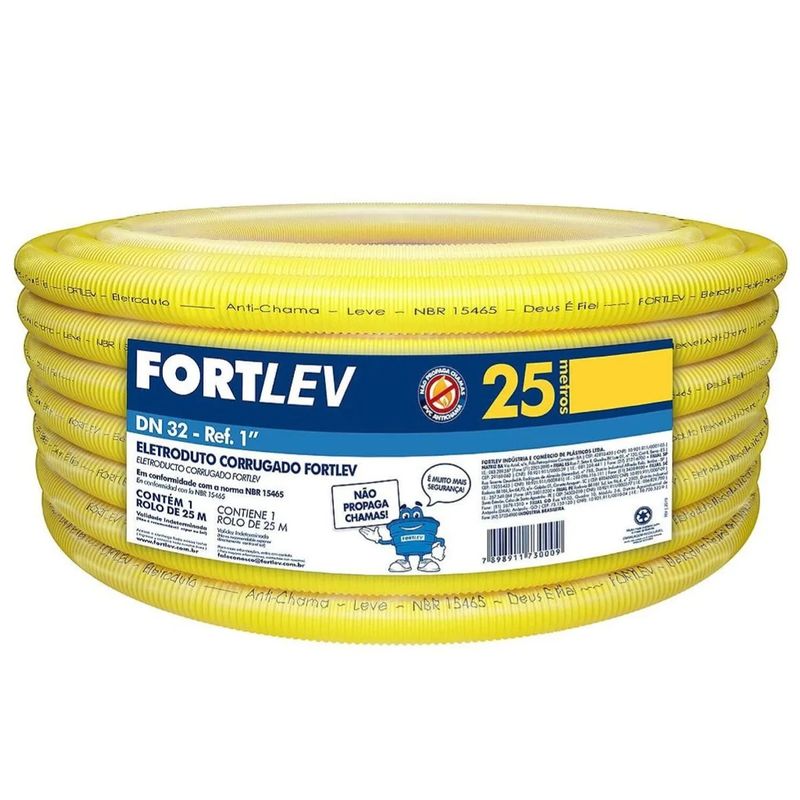 O conduíte flexível Fortlev 1” é indicado para a proteção e organização de fios e cabos em instalações elétricas residenciais, comerciais e prediais, especialmente em circuitos com maior volume de condutores. Fabricado em PVC de alta qualidade, oferece excelente flexibilidade, facilitando a passagem dos cabos mesmo em trajetos com curvas e desvios, sem comprometer a resistência mecânica. Na cor amarela, atende às normas de identificação para eletrodutos corrugados, garantindo segurança e padronização da instalação. Fornecido em rolo com 25 metros, é ideal para aplicações embutidas em paredes, lajes e pisos, proporcionando maior durabilidade, praticidade na obra e proteção eficiente da fiação elétrica.