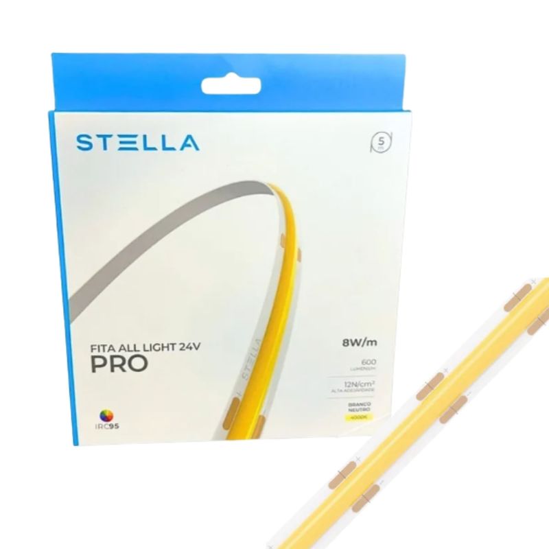 A Fita LED All Light PRO 24V 8W/m 5 m 4000 K da Stella é uma solução de iluminação em LED de alto desempenho, ideal para projetos que exigem luz branca neutra, eficiente e uniforme em ambientes internos.