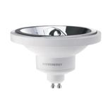 Lâmpada de LED, modelo AR111, potência 12W, ângulo 10°, fluxo luminoso 650lm, temperatura de cor 2700K - Luz Amarela, encaixa no soquete GU10, tensão elétrico - Bivolt (85-240V), ALTO IRC (Índice de Reprodução de Cor). Facho fechado e alta definição de cores, índice de proteção IP40 e certificada pelo Inmetro.