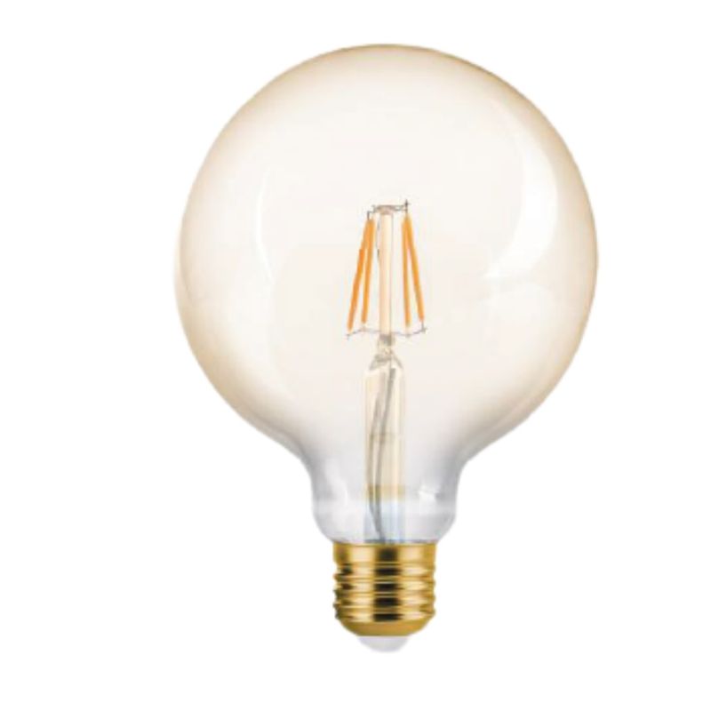 Lâmpada de LED, modelo G125 Filamento, estilo VINTAGE, potência 4W, fluxo luminoso 300lm, temperatura de cor 2200K - Luz amarela, encaixa no soquete E27, índice de proteção IP65 e material vidro âmbar.