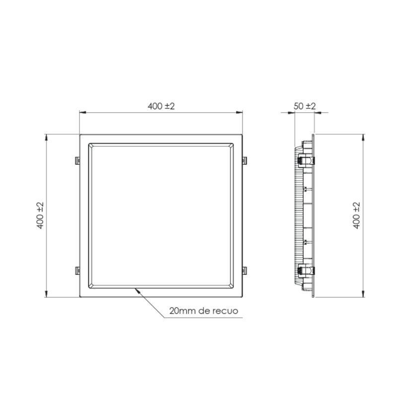 Painel de LED De Embutir Quadrada Recuada Branco de 40x40cm, potência 36W, ângulo 120°, fluxo luminoso 2300lm, índice de proteção IP20. Medida do nicho - 38x38x4,3 cm.